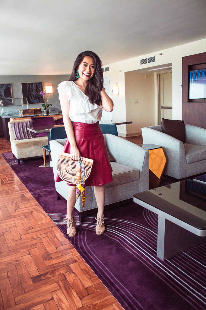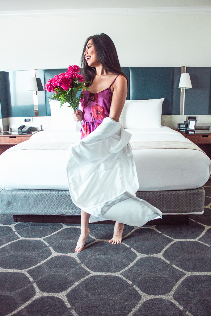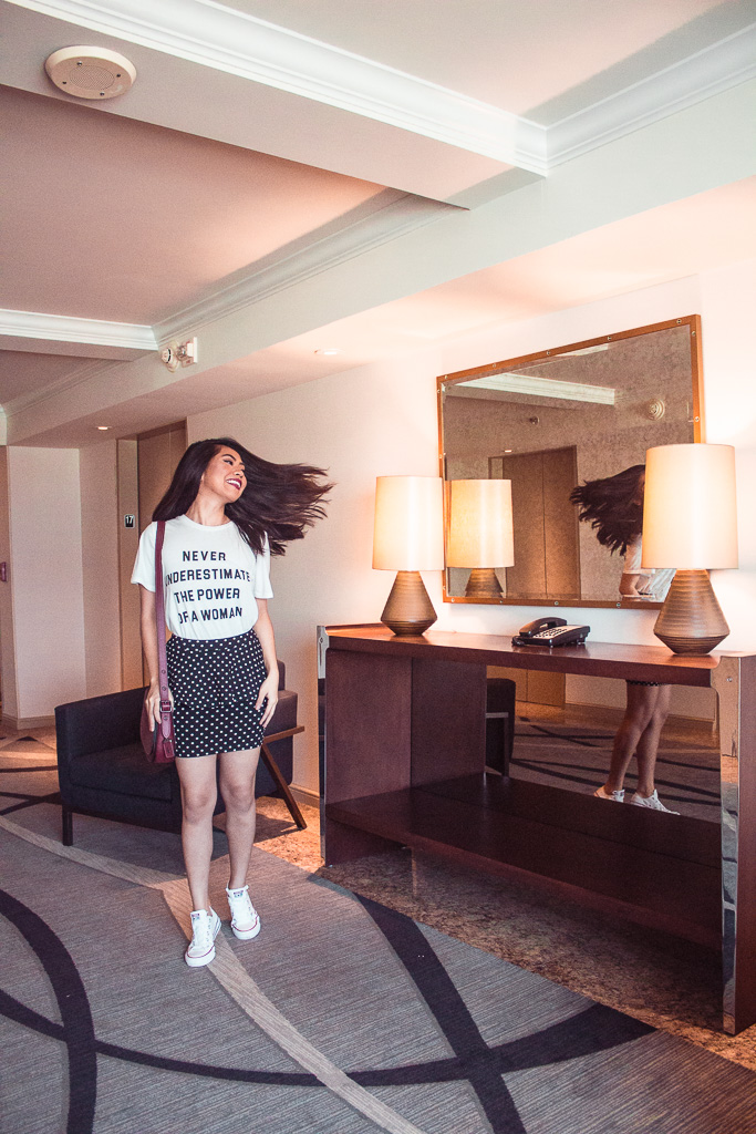 The lazy hotel room life officially begins! It was way too early to get dressed in pjs and lounge around the room. However, I couldn’t pass the opportunity to relax in my new bed. The hotel room had a crisp, white minimalistic design with neutral tones and prints. The entire decor and carpet flooring had a cohesive theme, and while the design is simple, I appreciated how cohesive the room looked. There was a TV right across from my bed and by the door was where the bathroom and closet area were located. What I loved most about the room was my window view of the city skyscrapers! I had never seen Uptown Houston so close-up before, and it was a huge pinch-me moment.